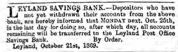 Or at least it was until we discovered this notice in the Preston Chronicle for 1869. So we now know when the Savings Bank was closed and where, if they were not withdrawn the remaining accounts were transferred to.