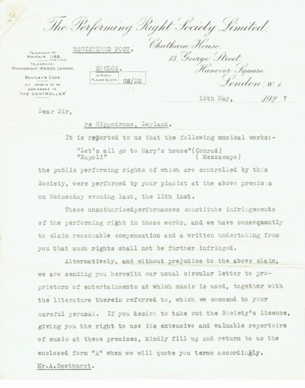 As well as the specific letter to the right, the Performing Right Society (today known as the PRS and still going strong), they also attached the above standard letter with a copy of the case law that established the PRS rights in this matter. As you will see below.