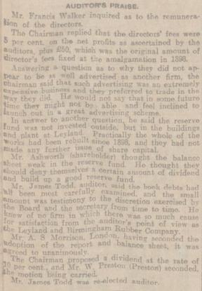 The changes made in the management of this firm after the somewhat unsatisfactory report at the annual meeting in 1905 seem to have worked well. At the meeting held in Leyland on August 10, Mr. James E. Baxter presiding, it was announced that the trading profits were £23,591. Compared with £9,508 in 1905.