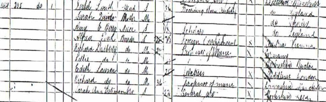 By the 1891 census Sarah had moved to 205 Brunswick Street in Chorlton upon Medlock when she ran a boarding house with her daughter Isabella (now Isabel) and niece Amy.