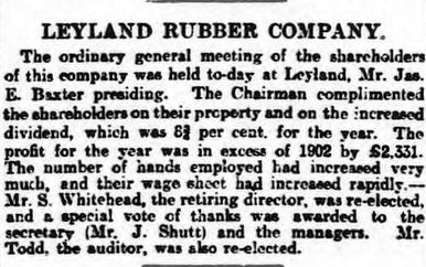 The dispute involving 14 dismissed employees was still ongoing. The Rev Wilson Stuart was quoted as saying “He would like to express his utter contempt for the management of the Leyland Rubber Works. He thought when he came to Leyland that he was coming to a fairly up-to-date place but found upon his arrival that it contained some people with regular antediluvian principles”.
